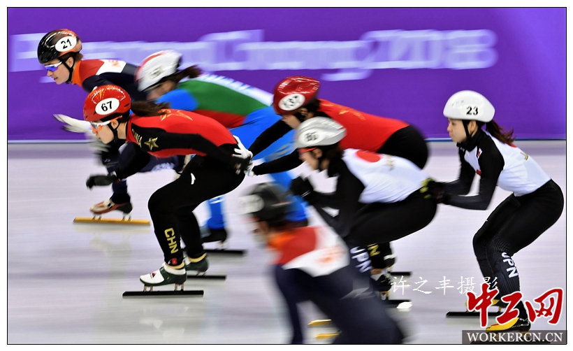 2018年2月10日,平昌冬奥会短道速滑项目比赛在韩国江陵冰上竞技场展开首日争夺。在女子3000米接力预赛中,由范可新、韩雨桐、周洋、曲春雨组成的中国队以4分05秒315的成绩在第二小组中打破了韩国队刚刚创造的奥运纪录,晋级该项目A组决赛。工人日报-中工网特派记者许之丰摄影报道