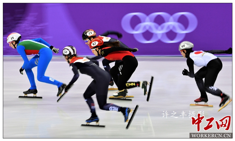 2018年2月10日,平昌冬奥会短道速滑项目比赛在韩国江陵冰上竞技场展开首日争夺。在女子3000米接力预赛中,由范可新、韩雨桐、周洋、曲春雨组成的中国队以4分05秒315的成绩在第二小组中打破了韩国队刚刚创造的奥运纪录,晋级该项目A组决赛。工人日报-中工网特派记者许之丰摄影报道