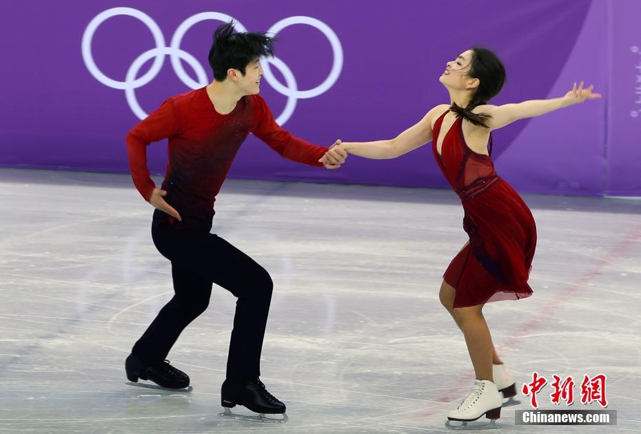 2月12日,美国队在平昌冬奥会江陵冰上体育场举行的花样滑冰团体赛中获得铜牌。图为美国队选手在比赛中。