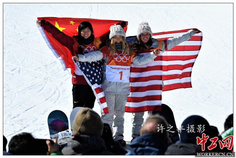 2018年2月13日上午,2018年平昌冬奥会单板滑雪女子U型场地决赛, 刘佳宇以89.75获得银牌,这是中国队在冬奥会该项目最好成绩,刘佳宇创造历史,同时这也是中国军团在平昌冬奥首枚奖牌。美国选手克洛伊*金夺得金牌。工人日报-中工网特派记者许之丰摄影报道