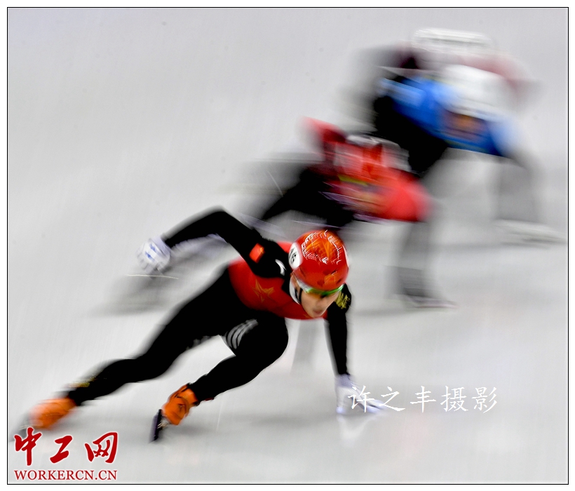2018年2月13日晚,平昌冬奥会短道速滑比赛,男子5000米接力预赛,由武大靖、韩天宇、许宏志、任子威组成的中国队表现出色,他们滑出了6分36秒605的好成绩打破奥运会纪录,进入A组决赛。工人日报-中工网记者许之丰摄影报道