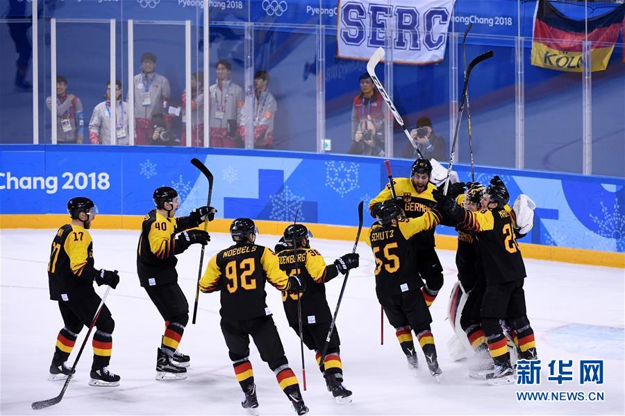 ↑2月21日,德国队球员在比赛结束后庆祝。当日,在关东冰球中心举行的2018年平昌冬奥会男子冰球四分之一决赛中,德国队以4比3战胜瑞典队,晋级四强。 新华社记者鞠焕宗摄