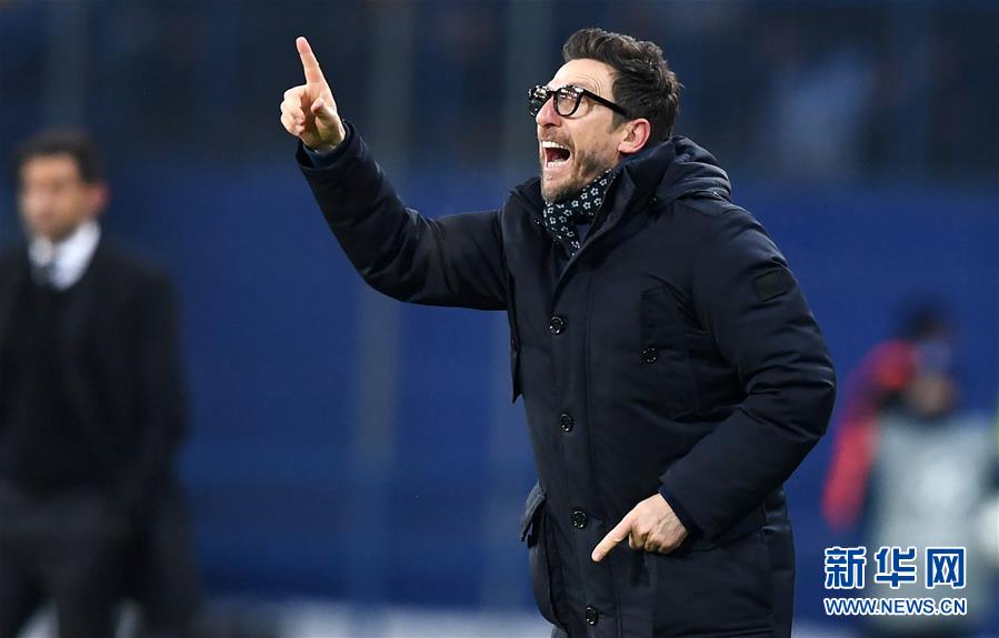↑2月21日,罗马队主教练迪弗朗西斯科在比赛中指挥。当日,在2017-2018赛季欧冠联赛八分之一决赛首回合比赛中,意大利罗马队客场以1比2不敌乌克兰顿涅茨克矿工队。 新华社/法新