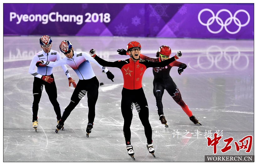 2月22日,2018平昌冬奥会短道速滑最后一个比赛日,在男子500米决赛中,中国选手武大靖以39秒584的成绩刷新自己在1/4决赛刚刚创造的世界纪录,为中国队赢得本届冬奥会第一枚金牌,而这枚金牌也是中国男子短道速滑选手的奥运首金。工人日报-中工网记者许之丰摄影报道