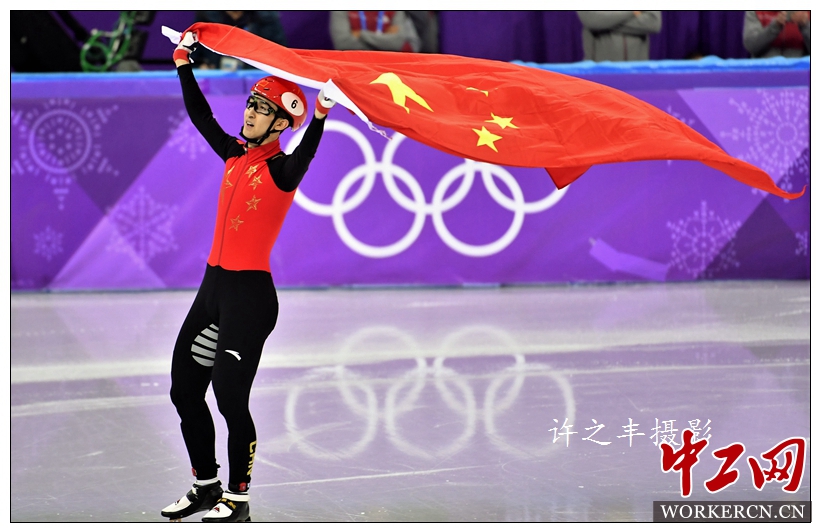 2月22日,2018平昌冬奥会短道速滑最后一个比赛日,在男子500米决赛中,中国选手武大靖以39秒584的成绩刷新自己在1/4决赛刚刚创造的世界纪录,为中国队赢得本届冬奥会第一枚金牌,而这枚金牌也是中国男子短道速滑选手的奥运首金。工人日报-中工网记者许之丰摄影报道