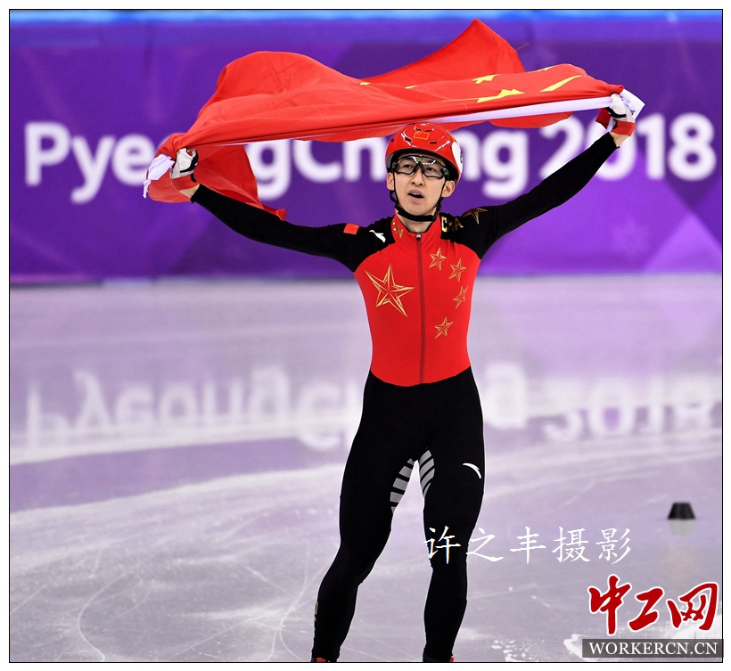 2月22日,2018平昌冬奥会短道速滑最后一个比赛日,在男子500米决赛中,中国选手武大靖以39秒584的成绩刷新自己在1/4决赛刚刚创造的世界纪录,为中国队赢得本届冬奥会第一枚金牌,而这枚金牌也是中国男子短道速滑选手的奥运首金。工人日报-中工网记者许之丰摄影报道