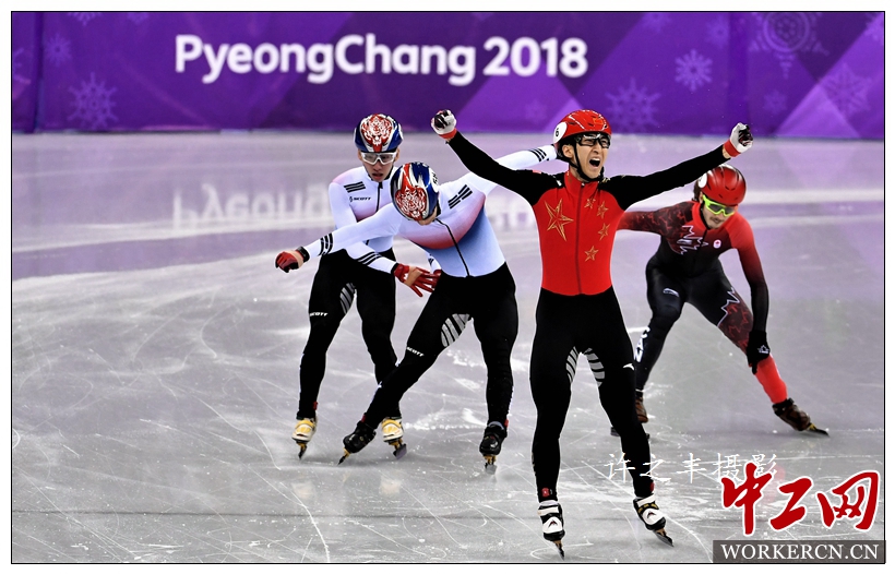 2月22日,2018平昌冬奥会短道速滑最后一个比赛日,在男子500米决赛中,中国选手武大靖以39秒584的成绩刷新自己在1/4决赛刚刚创造的世界纪录,为中国队赢得本届冬奥会第一枚金牌,而这枚金牌也是中国男子短道速滑选手的奥运首金。工人日报-中工网记者许之丰摄影报道