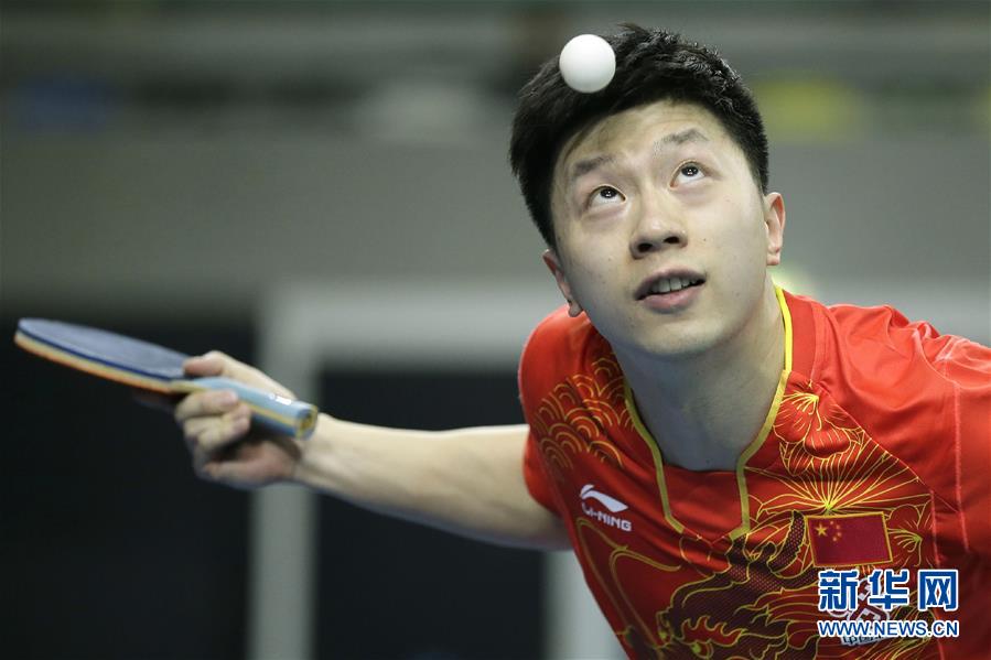 ↑2月22日,中国队选手马龙在比赛中发球。最终,他以3比0战胜法国队选手勒贝松。当日,在2018乒乓球世界杯团体赛男子小组赛中,中国队以3比0战胜法国队。 新华社发(蒂姆·爱尔兰摄)