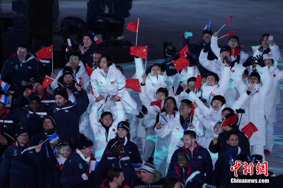 当地时间2月25日,2018平昌冬奥会闭幕式在平昌奥林匹克体育场举行,现场演出精彩夺目。图为中国运动员参加闭幕式。中新社记者 崔楠 摄