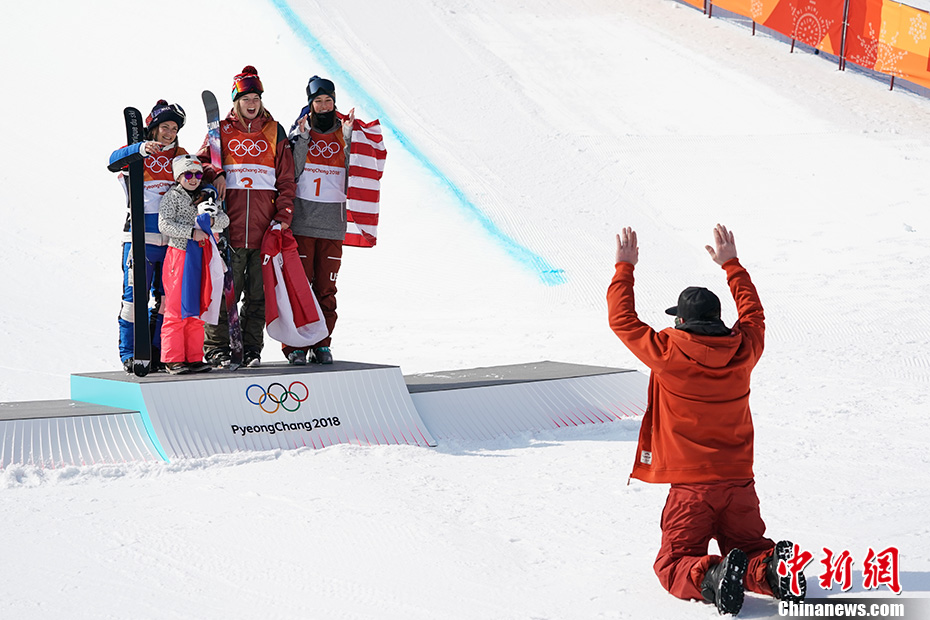 2月20日,平昌冬奥会自由式滑雪女子U型场地赛决赛落幕,加拿大选手卡西·夏普获得冠军,法国选手玛丽·马丁诺德和美国选手布里塔·西格妮分别获得第二和第三名。索契冬奥会卫冕冠军美国选手马迪·鲍曼决赛三轮均出现失误,无缘奖牌。中国15岁小将张可欣列第九名。图为玛丽·马丁诺德的丈夫向获得前三名的选手致意。