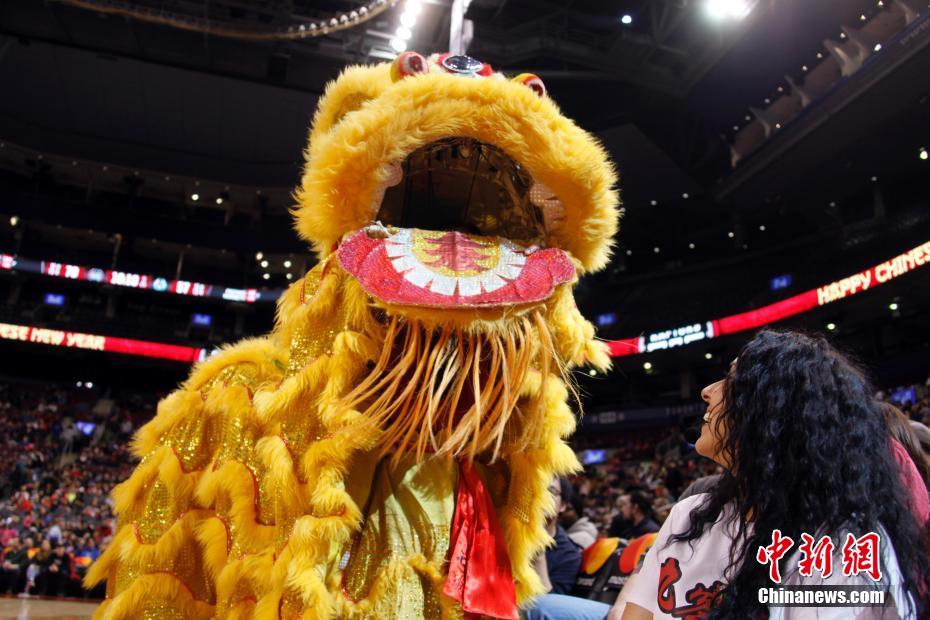 当地时间2月25日农历正月初十晚,美国男篮职业联赛发展联盟(NBA G League)球队猛龙905队在其母队多伦多猛龙队的主场举行中国新年特别赛事,迎战威斯康星鹿群队。图为比赛间隙,多伦多华社龙狮团在场内表演舞狮并与现场观众互动。 中新社记者 余瑞冬 摄
