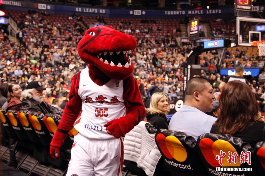 身披写有猛龙905队中文队名运动衫的吉祥物在场边穿梭助兴。 中新社记者 余瑞冬 摄