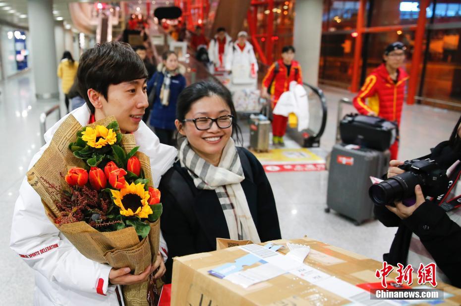 2月26日,中国短道速滑运动员韩天宇归国抵达北京首都国际机场,受到“粉丝”们的热情迎接。中新社记者 王骏 摄
