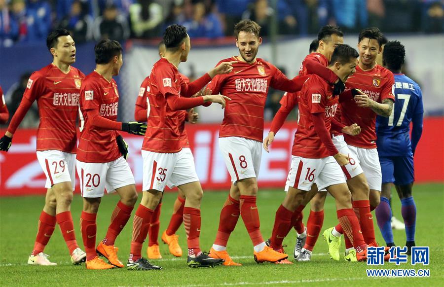 ↑2月26日,广州恒大淘宝队球员在比赛中庆祝进球。当日,在2018中国足球协会超级杯决赛中,广州恒大淘宝队以4比1战胜上海绿地申花队,夺得冠军。 新华社记者凡军摄