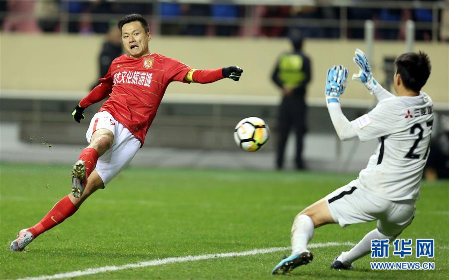 ↑2月26日,广州恒大淘宝队球员郜林(左)在比赛中射门得分。当日,在2018中国足球协会超级杯决赛中,广州恒大淘宝队以4比1战胜上海绿地申花队,夺得冠军。 新华社记者凡军摄