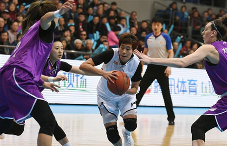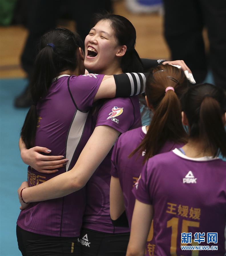 ↑2月27日,天津渤海银行女子排球队球员李盈莹(左二)与队友拥抱庆祝胜利。当日,在2017-2018赛季中国女子排球超级联赛半决赛第三回合比赛中,天津渤海银行女子排球队主场以3比0战胜辽宁三生制药沙鸥女子排球队,从而以3比0的总比分晋级决赛。新华社记者张誉东摄