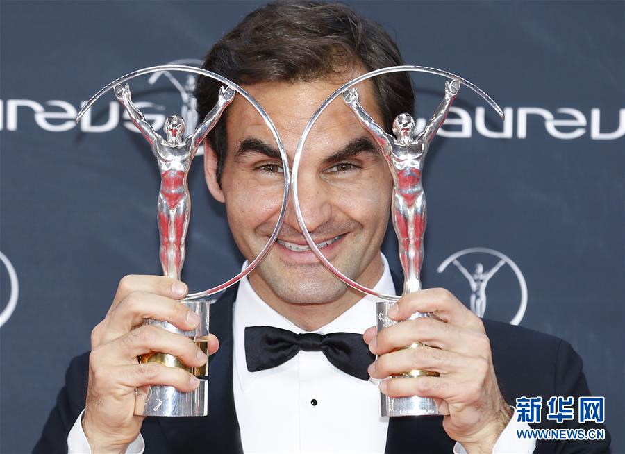 ↑2月27日,获得最佳男运动员和最佳复出奖的瑞士网球运动员费德勒展示奖杯。 新华社记者叶平凡摄