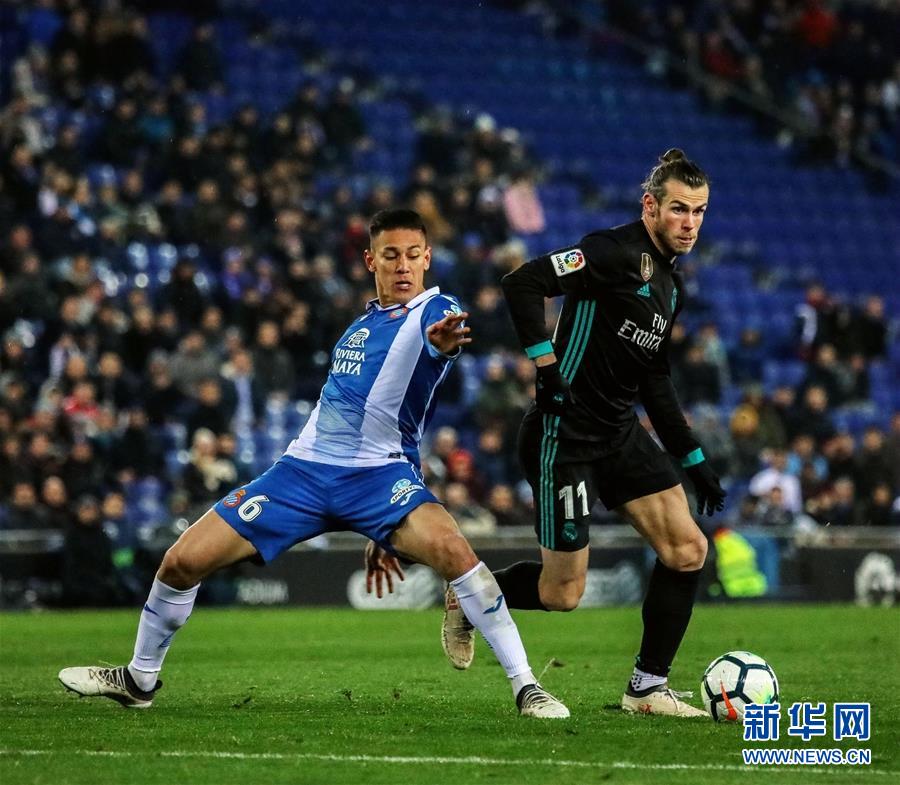 ↑2月27日,西班牙人队球员杜阿尔特(左)与皇家马德里队球员贝尔在比赛中拼抢。当日,在2017-2018赛季西班牙足球甲级联赛第26轮比赛中,西班牙人队主场以1比0战胜皇家马德里队。 新华社发(胡安·戈萨摄)