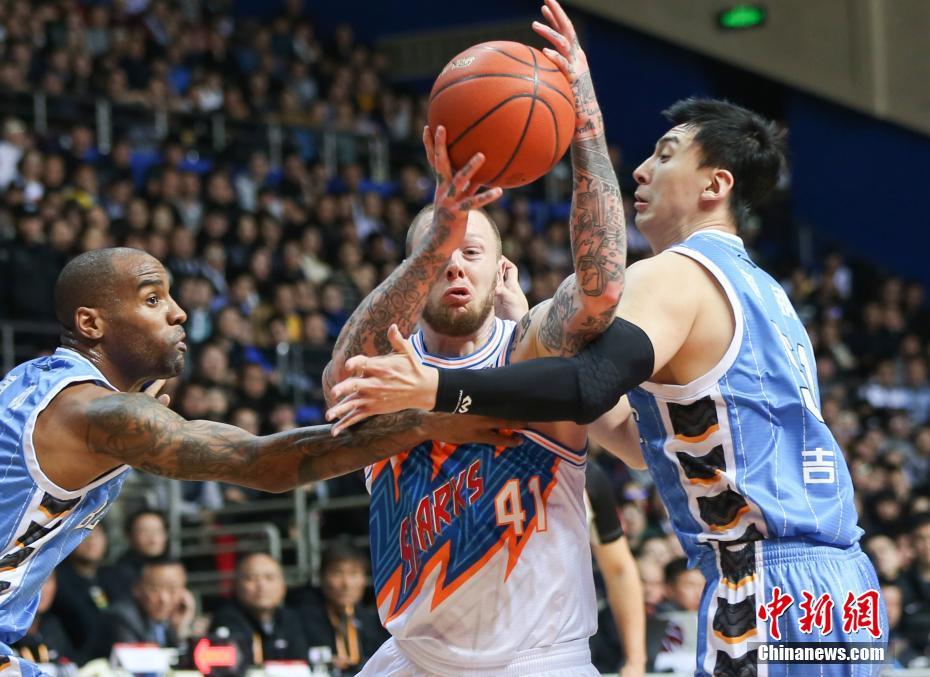 上海队外援在北京队的包夹中,寻求投篮机会。张亨伟 摄