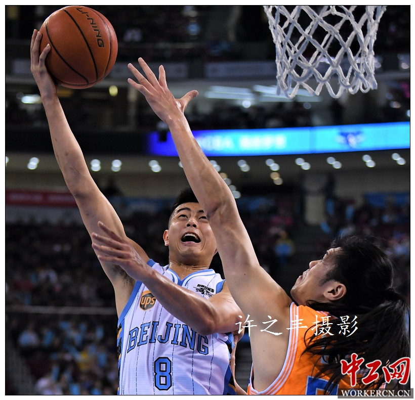 2018年3月10日晚,2017-18赛季CBA季后赛,在五棵松体育馆北京队与上海队展开10进8附加赛第三回合比赛,北京队以97比72胜上海队,以总比分2比1战胜对手晋级八强。在四分之一决赛中,北京队将对阵辽宁队。图为北京与上海的比赛瞬间。工人日报-中工网记者许之丰摄影报道