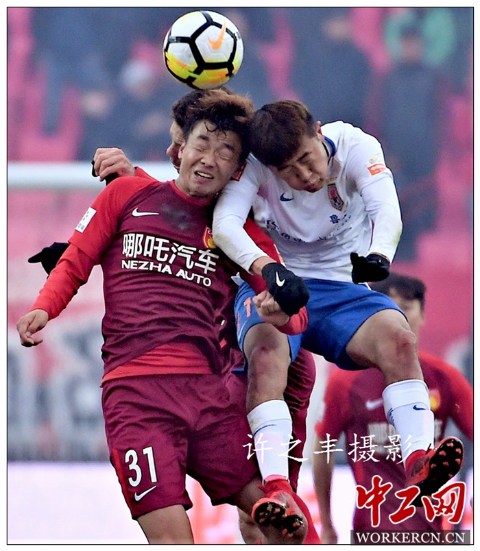 3月17日下午,2018赛季中超联赛第三轮,河北廊坊体育场飘起雪花,双方迎来一场雪战。河北华夏幸福队主场与山东鲁能泰山队比赛,第33分钟,鲁能队佩莱直塞助攻,塔尔德利推射破门。第38分钟,华夏队马斯切拉诺发出任意球,拉维奇助攻宋文杰破门扳平比分。第53分钟,鲁能队蒿俊闵送出过顶传中,塔尔德利反越位破门打入制胜球。最终客场作战的鲁能泰山队2比1战胜河北华夏幸福队,以三连胜战绩暂时在积分榜首位。工人日报-中工网记者许之丰摄影报道