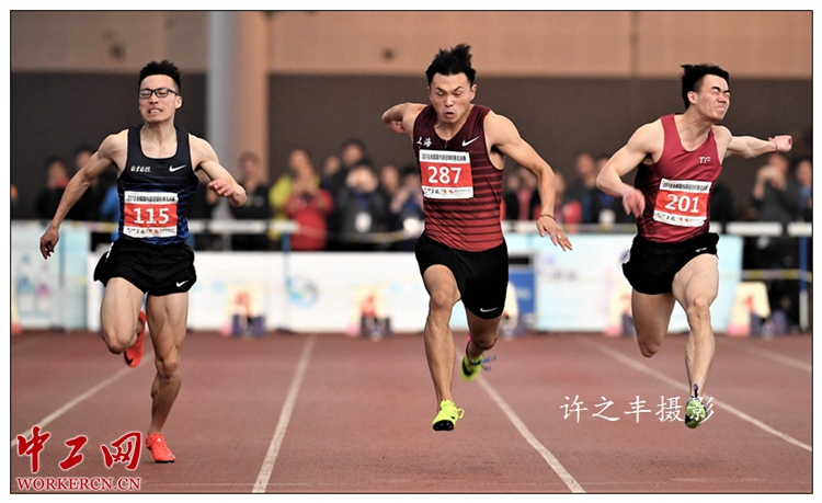 3月23日,2018年全国室内田径锦标赛总决赛,在北京体育大学举行。在男子60米决赛中,上海选手许周政(287号)跑出6.48秒的亚洲第二好成绩夺得冠军。工人日报-中工网记者许之丰摄影报道