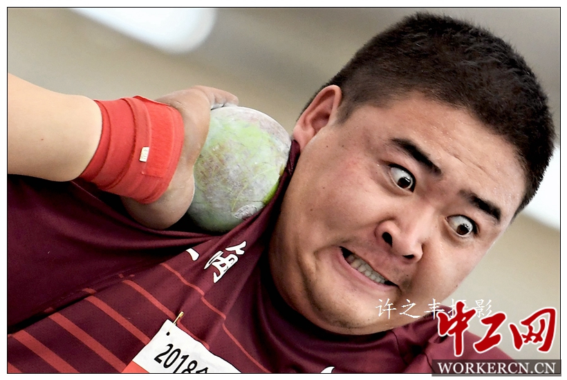 3月24日,2018年全国室内田径锦标赛总决赛在北京体育大学举行, 在男子铅球决赛中解放军选手田子重获得第一名,辽宁选手吴佳祥获得第二名,江苏选手李竣获得第三名,图为铅球比赛运动员们投掷瞬间。工人日报-中工网记者许之丰摄影报道