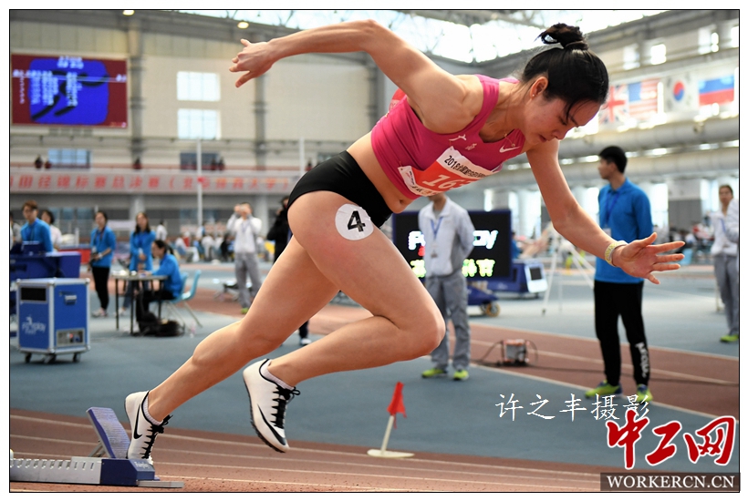 2018年3月24日,全国室内田径总决赛在北京体育大学举行,在女子200米决赛,广西选手韦永丽以23秒67的成绩夺冠,这也是她本次总决赛继女子60米夺冠后收获的第二冠。福建选手林慧君以23秒71的成绩收获亚军 ,黑龙江选手孔令微以23秒84的成绩获得季军。图为韦永丽在200米比赛。工人日报-中工网记者许之丰摄影报道