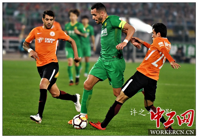 2018年3月31日晚,中超第4轮比赛,北京中赫国安主场以4比0战胜北京人和。比赛半场结束前索里亚诺以精彩任意球为国安打破僵局,下半场于洋、比埃拉与于大宝相继入球。国安收获三连胜。图为双方比赛瞬间。工人日报-中工网记者许之丰摄影报道