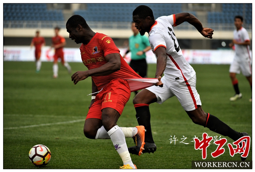 2018年4月1日下午,北京奥体中心体育场,中国足球甲级联赛第四轮比赛,北京北控燕京主场以0比1负于辽宁沈阳宏运队。图为双方在比赛中的对抗。工人日报-中工网记者许之丰摄影报道