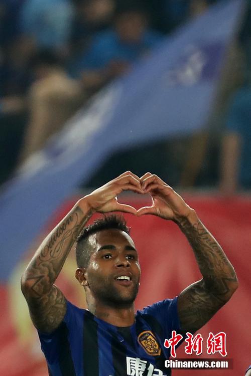 4月1日晚,在南京奥体中心举行的中超联赛第4轮中,江苏苏宁足球队以2比1击败天津泰达队。图为江苏苏宁队球员特谢拉进球后庆祝。中新社记者 泱波 摄