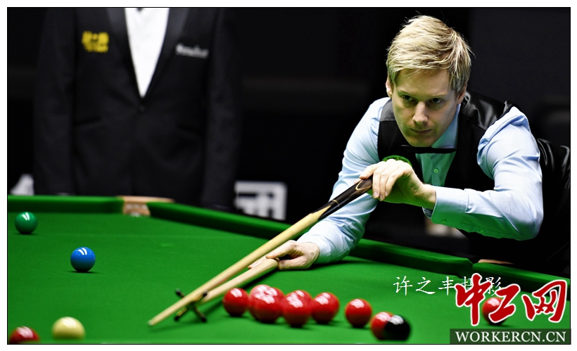 4月7日晚,2018赛季斯诺克中国公开赛,在半决赛的比赛中,英格兰名将霍金斯完成两杆破百,最终以10比6击败澳大利亚名将罗伯逊,职业生涯首次打进中国公开赛决赛。工人日报-中工网记者许之丰摄影报道