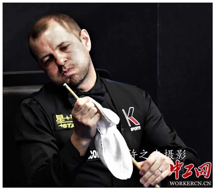 4月7日晚,2018赛季斯诺克中国公开赛,在半决赛的比赛中,英格兰名将霍金斯完成两杆破百,最终以10比6击败澳大利亚名将罗伯逊,职业生涯首次打进中国公开赛决赛。工人日报-中工网记者许之丰摄影报道