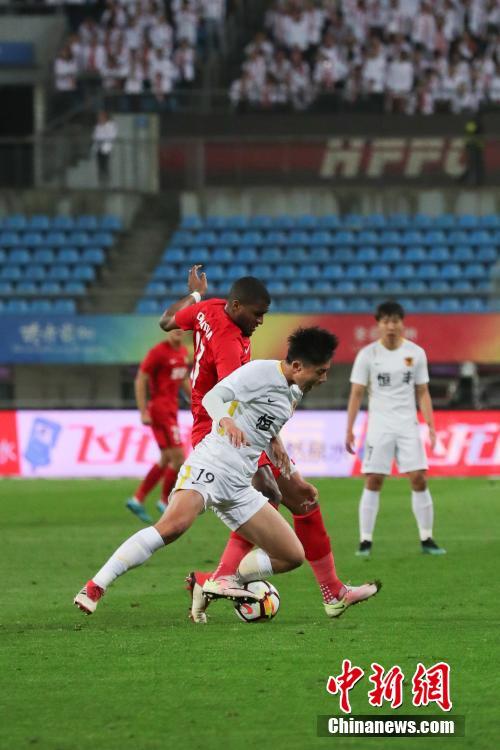 4月8日,贵州恒丰19号球员郑凯木(白)在比赛中持球突破。当日,中超第5轮继续展开争夺,贵州恒丰在贵阳迎战天津权健。最终,贵州恒丰0-1主场不敌天津权健。 中新社记者 贺俊怡 摄