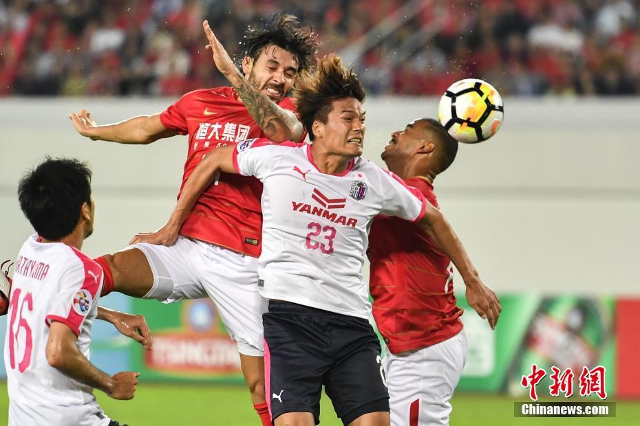 4月17日晚,广州恒大球员高拉特与对手争抢头球。当晚,2018赛季亚冠联赛小组赛最后一轮收官战展开,广州恒大主场3比1战胜大阪樱花。至此,恒大凭借3胜3平积12分的不败战绩,以小组头名出线。中新社记者 陈骥旻 摄