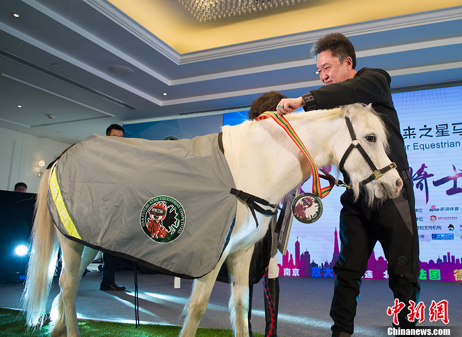 2018年4月18日,2018“新浪杯”未来之星马术大赛新闻发布会在北京举行,奥运马术三项骑手华天受邀担任大赛形象大使,歌手尚雯婕担任“中国青少年马术文化推广大使”,著名相声表演艺术家于谦担任“中国少年儿童马文化大使”,体操世界冠军莫慧兰也到现场助阵。图为于谦在发布会现场与小马互动,画面十分有爱。 中新网记者 李卿 摄
