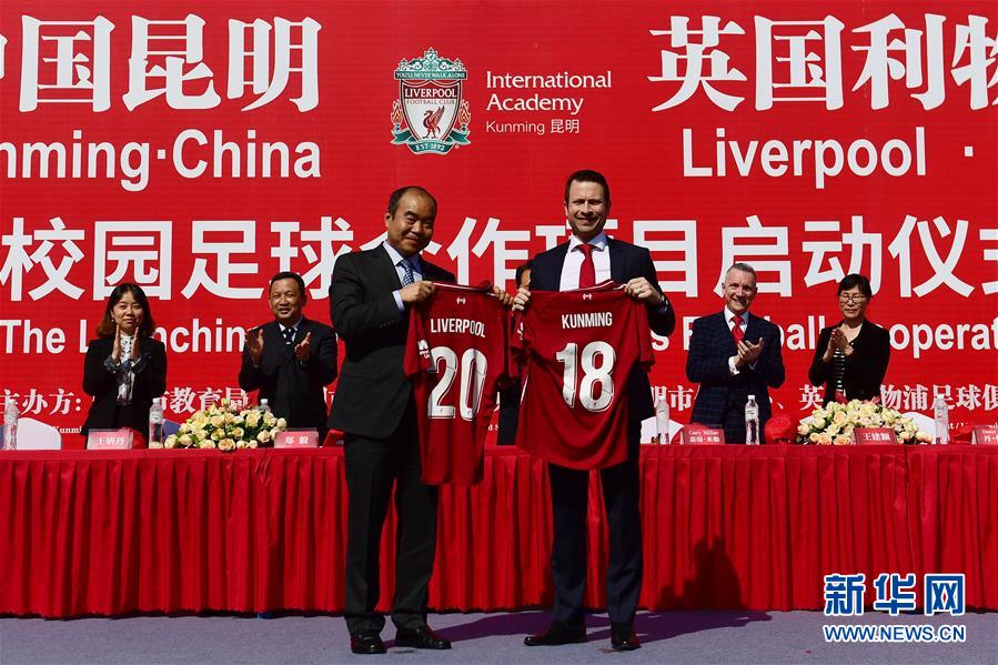 ↑4月24日,云南省教育厅副厅长郑毅(前左)与英国利物浦足球俱乐部国际学院负责人丹·怀特互赠球衣。当日,昆明市政府与英国利物浦足球俱乐部在昆明市第三中学签署校园足球合作协议。未来6个月,昆明的10所学校将接受利物浦足球俱乐部为其量身定制的培训内容,包含了对学生和教练员的培训。新华社记者胡超摄