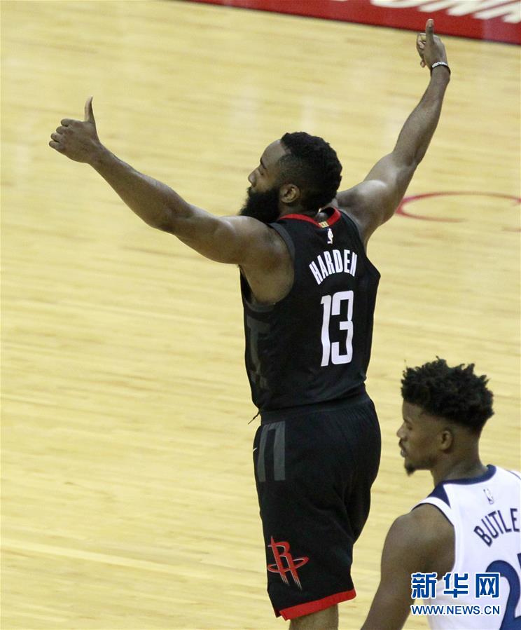 ↑4月25日,火箭队球员哈登(左)在比赛中庆祝投进三分球。当日,在2017-2018赛季NBA季后赛第五场比赛中,休斯敦火箭队主场以122比104战胜明尼苏达森林狼队,从而以总比分4比1晋级西部半决赛。新华社发(宋穹摄)