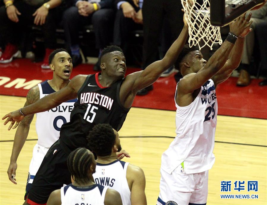 ↑4月25日,火箭队球员卡佩拉(上中)与森林狼队球员巴特勒(上右)在比赛中拼抢。新华社发(宋穹摄)