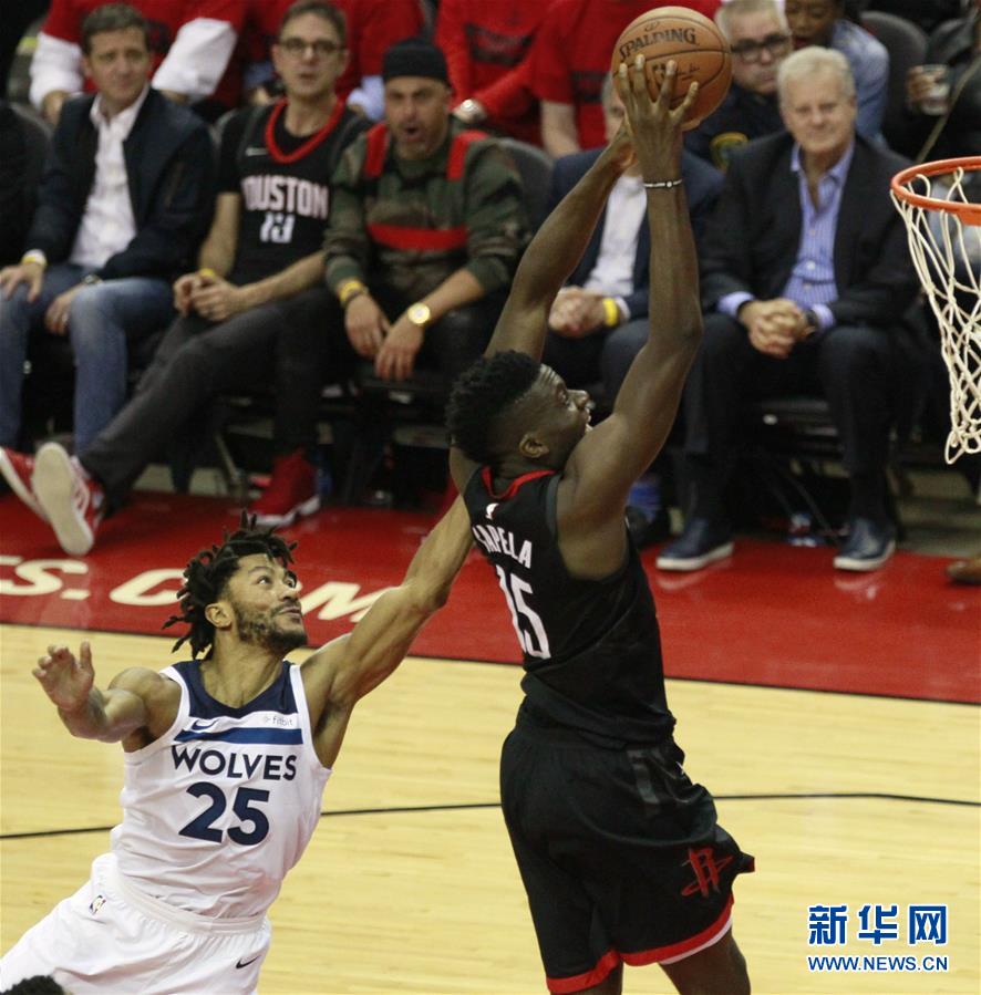 ↑4月25日,火箭队球员卡佩拉(右)在比赛中上篮。新华社发(宋穹摄)
