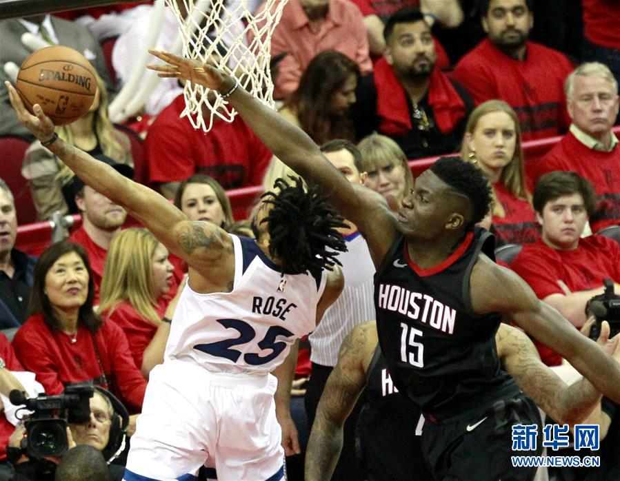 ↑4月25日,火箭队球员卡佩拉(右)在比赛中防守森林狼队球员罗斯。新华社发(宋穹摄)