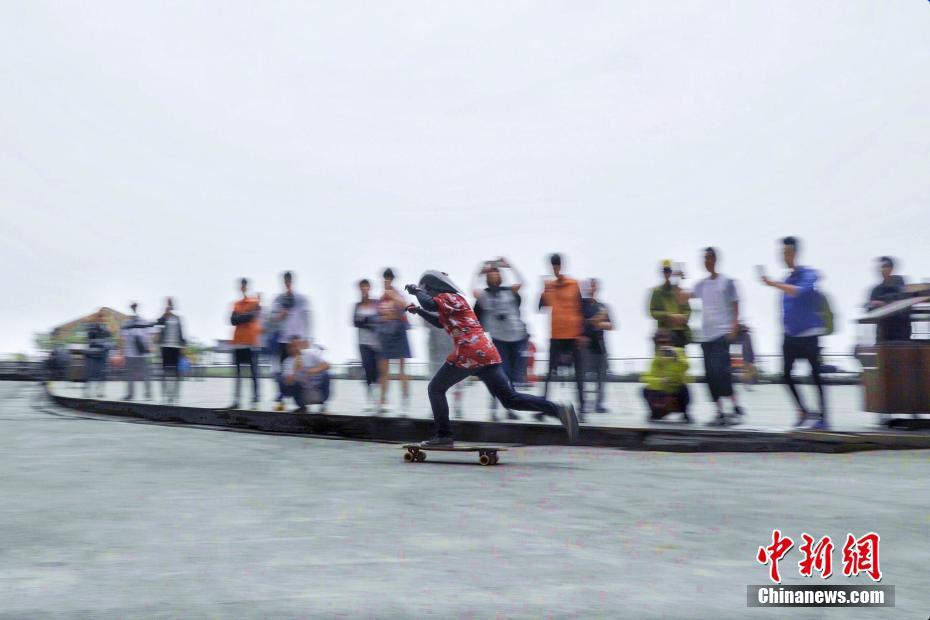 卿运辉用脚蹬滑板加速。丁云娟 摄