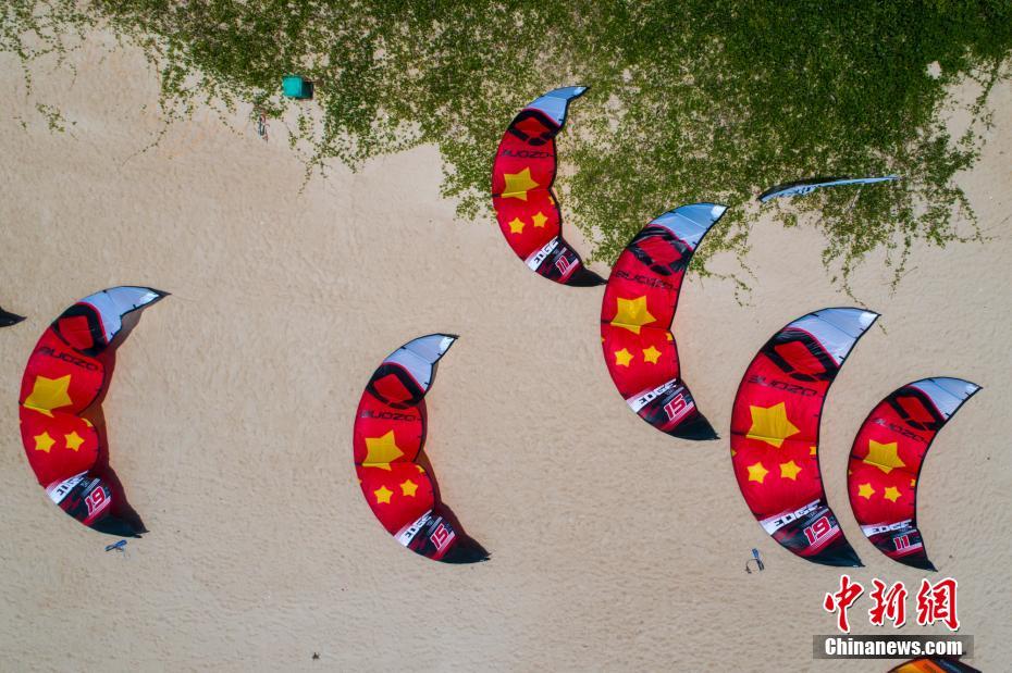 5月8日,2018中国博鳌国际风筝冲浪节青奥会资格赛第五个比赛日在海南省琼海市博鳌镇附近海域举行。据了解,此次比赛共吸引了来自32个国家19岁以下的100名运动员参加,角逐2018阿根廷布宜诺斯艾利斯青年奥林匹克运动会风筝冲浪项目的男、女各四名参赛名额。图为航拍中国风筝帆板队的参赛风筝在沙滩上。 骆云飞 摄