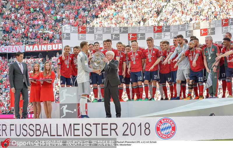 人民网北京5月13日电(欧兴荣)虽然在最后一轮主场1-4不敌斯图加特,但拜仁还是以27胜3平4负的成绩获得德甲六连冠,领先第二名的沙尔克04达到21分。莱万多夫斯基本赛季为拜仁打进了29个联赛进球,是排在射手榜第二名彼得森进球数的近两倍,莱万也第三次夺得德甲小钢炮,成为德甲第一位三夺小钢炮的外籍球员。在北京时间今晨与斯图加特的赛后,拜仁举行盛大的夺冠颁奖仪式,彩带、伯尼熊、啤酒、笑容一个都不能少!