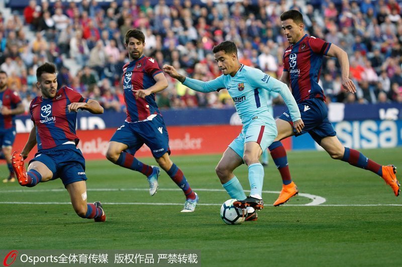 人民网北京5月14日电(李乃妍)北京时间今晨02:45,2017/18赛季西甲第37轮一场焦点战在瓦伦西亚市政球场展开争夺,巴塞罗那客场4比5不敌莱万特,博阿滕帽子戏法,巴尔迪梅开二度。库蒂尼奥帽子戏法,苏亚雷斯射入点球。巴萨本赛季联赛不败金身告破,连续43场联赛不败被终结。