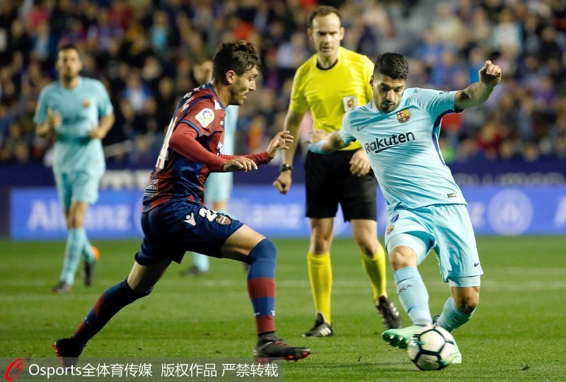 人民网北京5月14日电(李乃妍)北京时间今晨02:45,2017/18赛季西甲第37轮一场焦点战在瓦伦西亚市政球场展开争夺,巴塞罗那客场4比5不敌莱万特,博阿滕帽子戏法,巴尔迪梅开二度。库蒂尼奥帽子戏法,苏亚雷斯射入点球。巴萨本赛季联赛不败金身告破,连续43场联赛不败被终结。