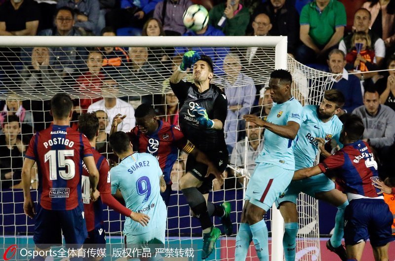 人民网北京5月14日电(李乃妍)北京时间今晨02:45,2017/18赛季西甲第37轮一场焦点战在瓦伦西亚市政球场展开争夺,巴塞罗那客场4比5不敌莱万特,博阿滕帽子戏法,巴尔迪梅开二度。库蒂尼奥帽子戏法,苏亚雷斯射入点球。巴萨本赛季联赛不败金身告破,连续43场联赛不败被终结。