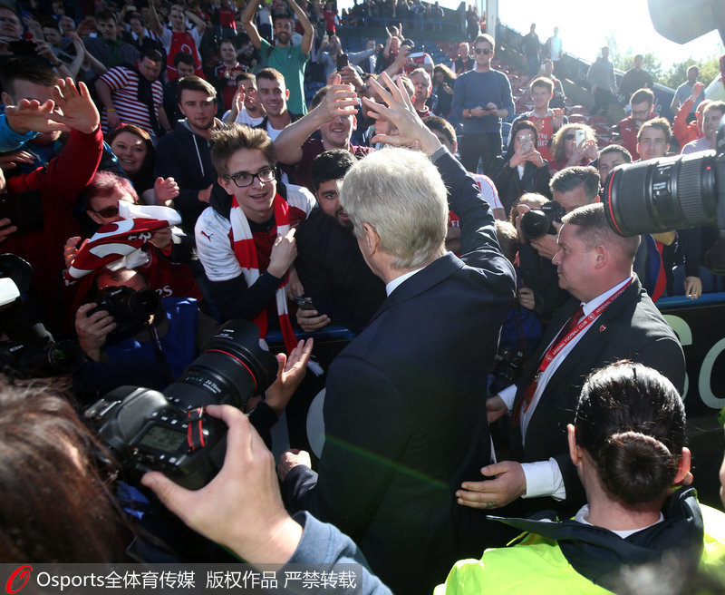 人民网北京5月14日电(杨磊) 北京时间5月13日晚,本赛季英超联赛最后一轮展开争夺,阿森纳客场1-0战胜哈德斯菲尔德,枪手主教练温格完成了自己执教阿森纳的最后一场比赛,全场球迷向温格致敬。