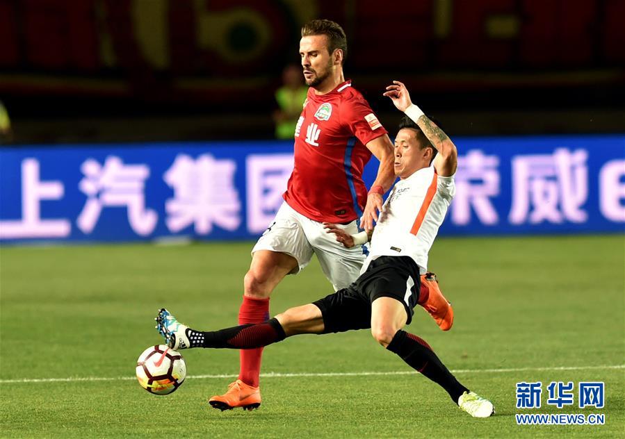 ↑5月13日,河南建业队球员奥兰多·萨(左)与北京人和队球员罗歆在比赛中拼抢。当日,在2018赛季中超联赛第10轮比赛中,河南建业队主场以1比0战胜北京人和队。 新华社发(李嘉南摄)