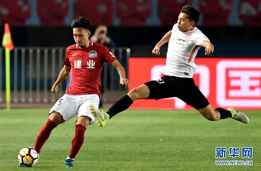 ↑5月13日,河南建业队球员陈灏(左)与北京人和队球员曹永竞在比赛中拼抢。 新华社发(李嘉南摄)